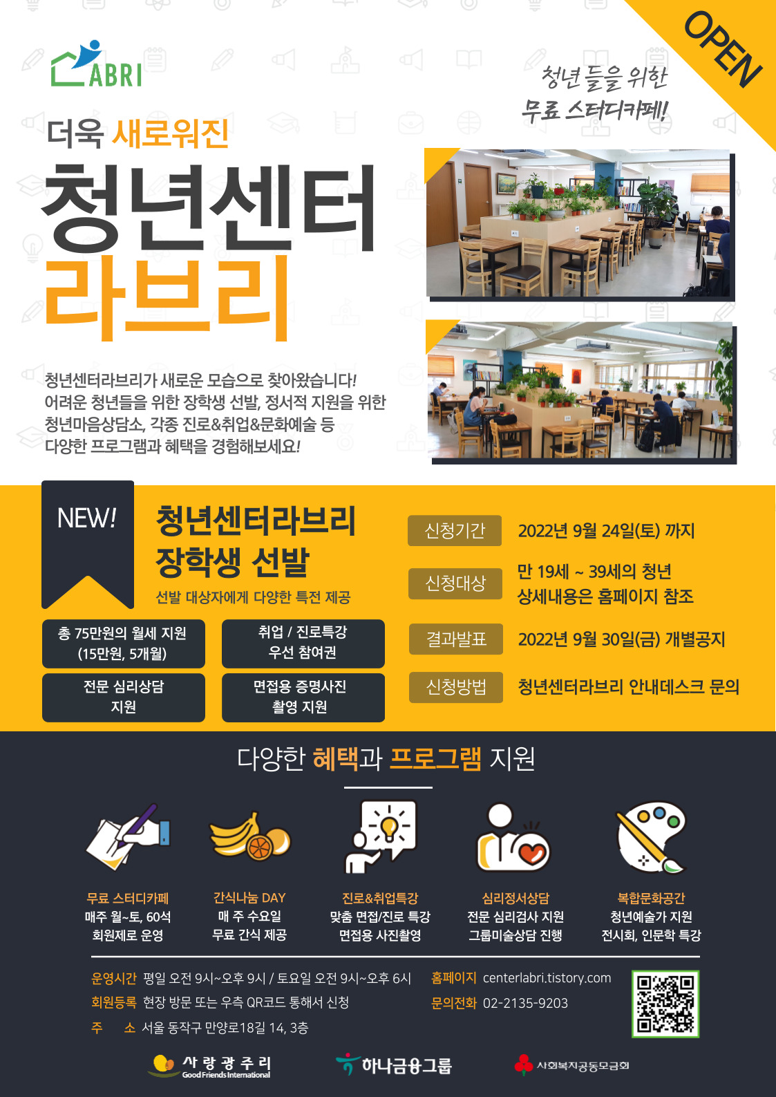 특별히 이번 리뉴얼에서 주목할 점은 '청년센터라브리 장학생'을 선발한다는 것입니다!