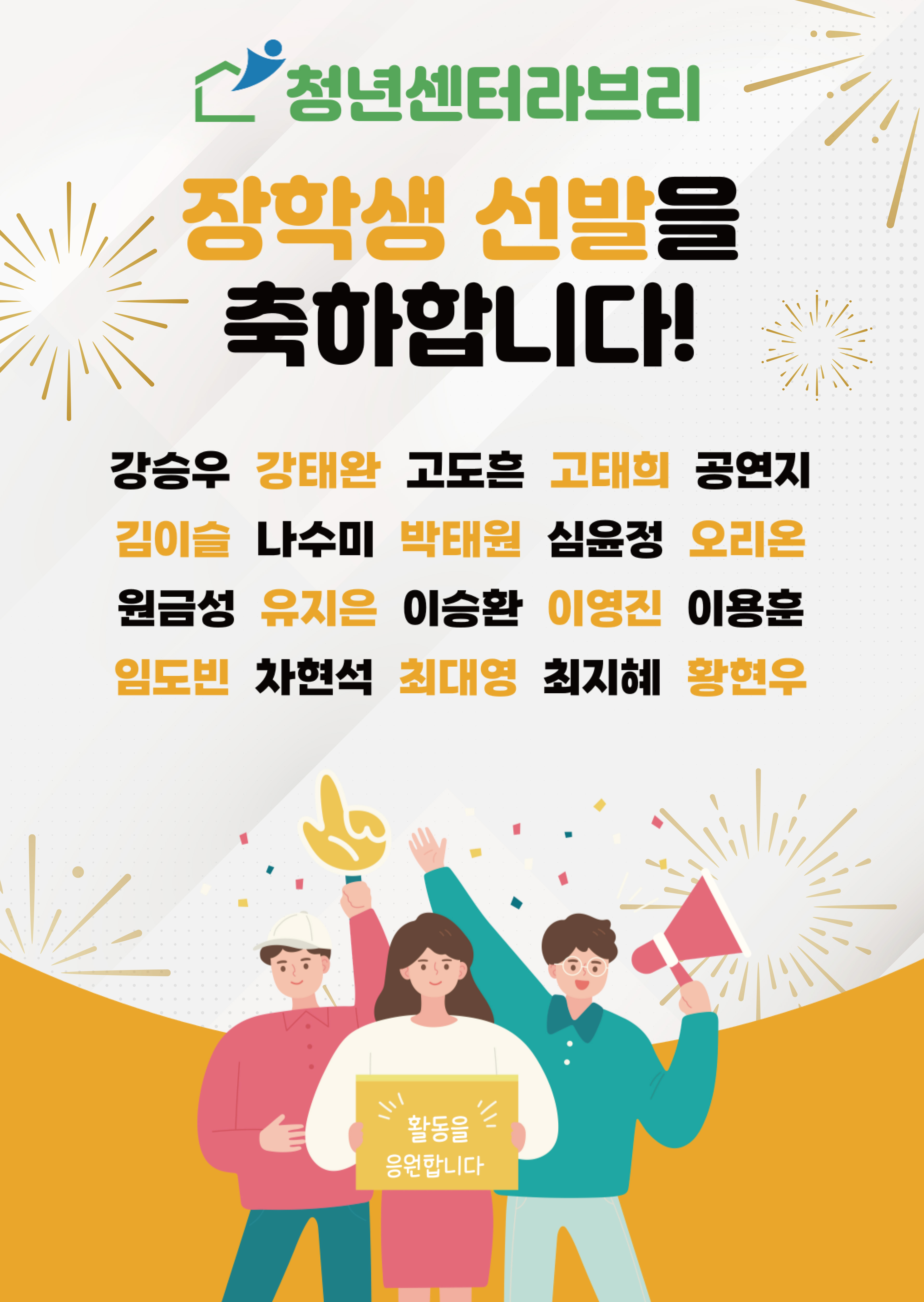 선발되신 20명의 장학생 분들 축하드리며, 장학생 활동에 관심을 갖고 지원을 해주신 많은 분들께 감사드립니다.^^